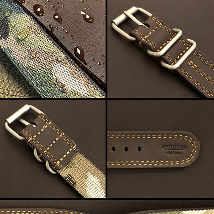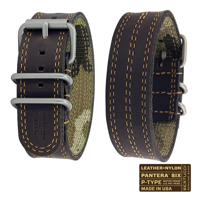 The innovative Bertucci® PANTERA™ SIX Survival Leather Band sets the standard for watch bands. Simply unmatched in durability, comfort, long life and water resistance. The ultimate band for the Ultimate Field Watch™. The U.S. Patent pending design is made in the USA from proprietary USA made materials to create incredible long lasting durability and light weight comfort. Crafted from high performance top grain water proof leather and rugged military spec. jacquard webbing. Featuring ultra-duty six row and hand wrap stitched construction, and Bertucci® Montanaro™ matte stainless steel buckle & dual keeper loops. One size fits all. Industry leading 3 year warranty.