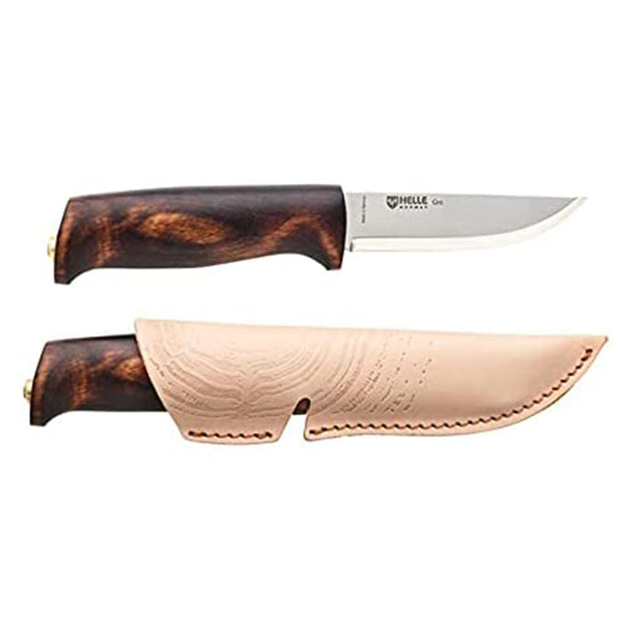 Helle Gro Dark Birch Handle Sandvik 12C27 Blade Knife - HELLE07. The Helle Gro (Norwegian for "grow") is a basic no-frill camping knife with a 3 ½ "(3.661 in) blade of Sandvik 12C27 steel and a dark birch handle that fits medium-sized hands. Very suitable For carving, food preparation, utility uses, or other camping chore uses, the embossed natural leather sheath depicts the annual rings of a truso; reminding the owner that learning is an ongoing process.
