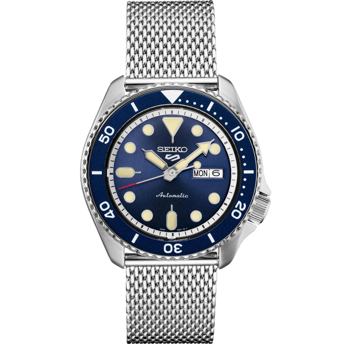 Show your style. Make your move. To a real watch, from a company that knows what real watchmaking is: the Seiko 5 Sports Collection. For reliable timing in your everyday life, this timepiece is powered by an automatic movement with a power reserve of approximately 41 hours and features a day/date calendar, LumiBrite hands and markers, and a see-through caseback. With a durable stainless steel case and contemporary mesh bracelet, and blue sunray dial framed by a blue rotating bezel, this versatile watch is 100 meter water resistant- perfect for your style no matter what your day has in store.
