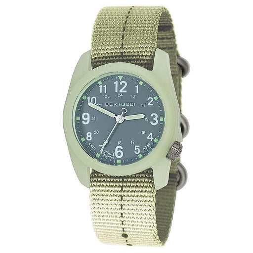 11128Bertucci DX3 Unisex Dark Green Dial Glow with Vintage Drab Black Dash Line Nylon Band Quartz Watch The DX3 PLUS Watch is built with a U.S. patented...