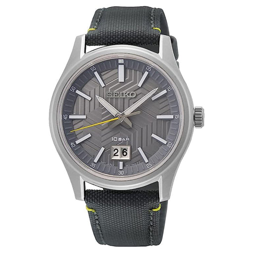 SUR543SEIKO Men's Gray Dial Black Nylon Band Quartz Watch The Seiko watch comes with a silver-tone stainless steel case with a grey dial, a fixed silver-...