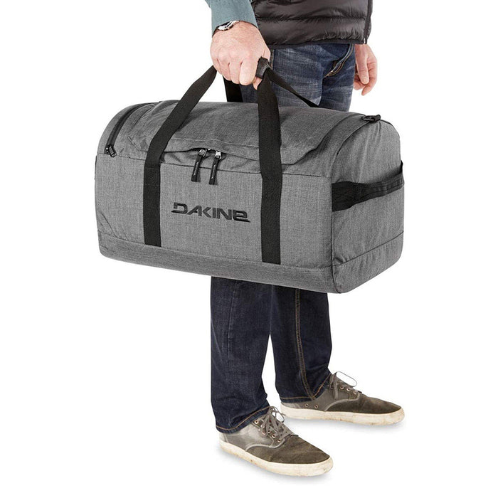 Dakine Unisex Black EQ Duffle 50L Bag - 10002935-BLACK. A midsize travel duffle with easy access to 50 liters of space. Road tripping and gear hauling made easy. It's hard to beat the all-around versatility of a durable duffle bag. The 50-liter Dakine EQ duffle adds a full-length U-shaped opening for easy access to its generous main compartment. There's a zip end pocket to keep small items easy to find and the whole bag stuffs into the end pocket for easy storage when empty.