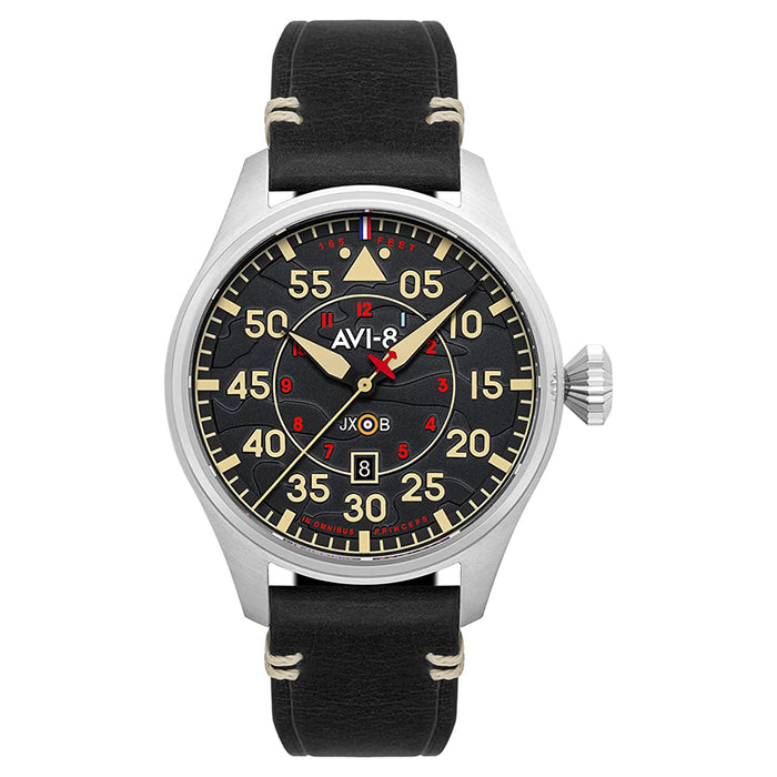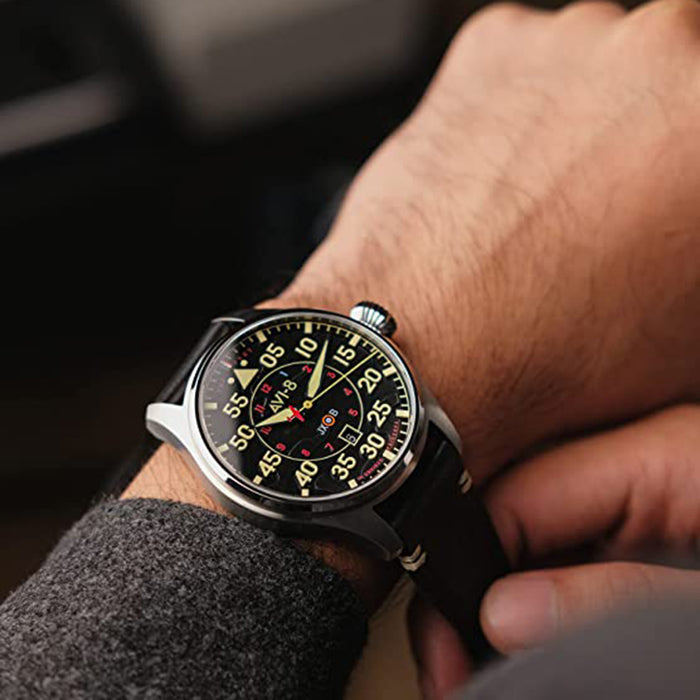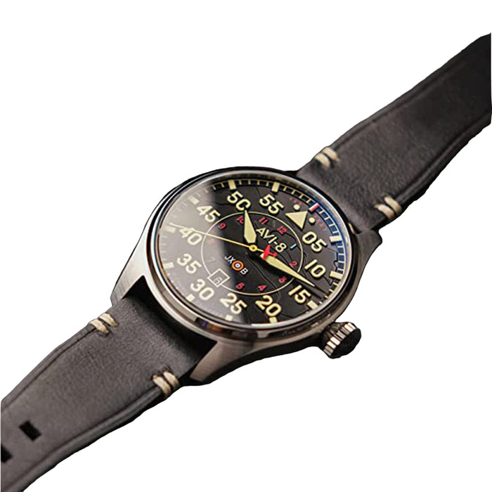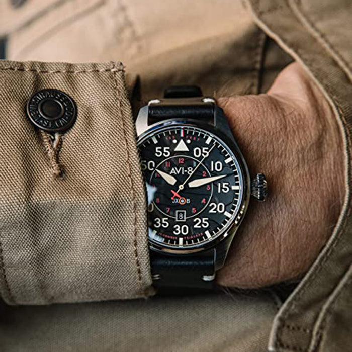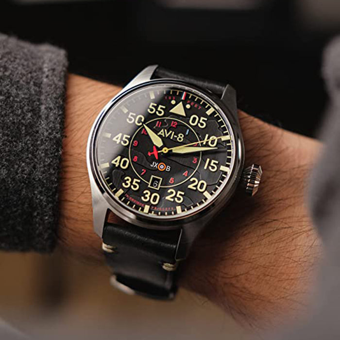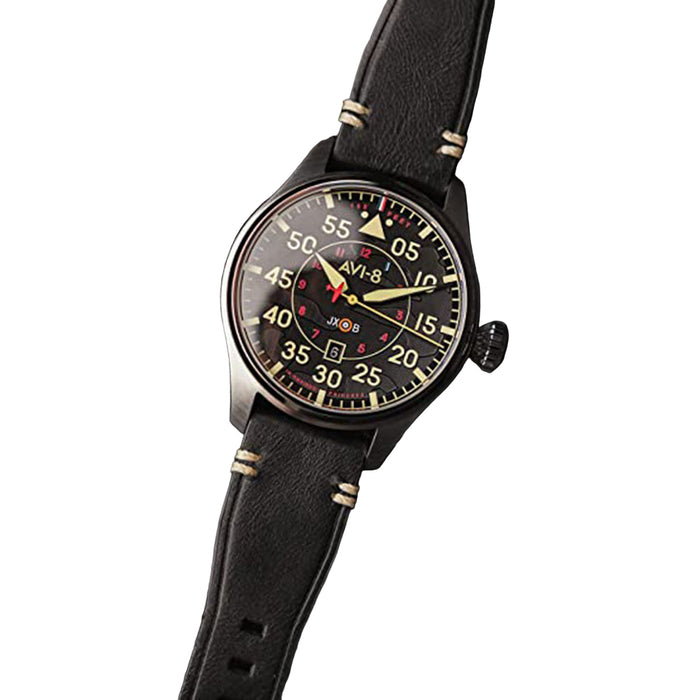 AVI-8 Men's Black Dial Leather Band Hawker Hurricane Clowes Japanese Automatic Pilot Watch - AV-4097-03