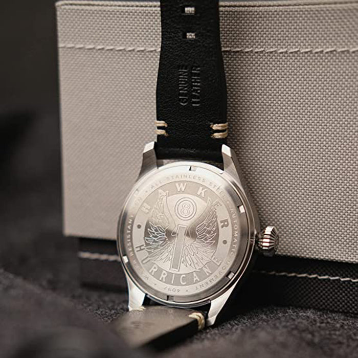 The brand inspiration and design excellence originate from the collaboration between pilots and engineers who served in air forces around the world. Every collection is an explicit homage to the planes, people, and history of military aviation. Each timepiece brings to life the detail and narrative of the inspiration to delight and engage the wearer. The Hawker Hurricane Clowes Automatic features a 46mm stainless steel case, a 22mm genuine leather strap, a sapphire lens with an anti-reflective coating, and water resistance of 50 meters.