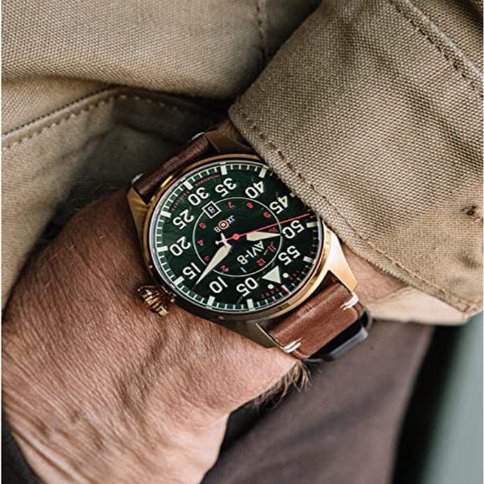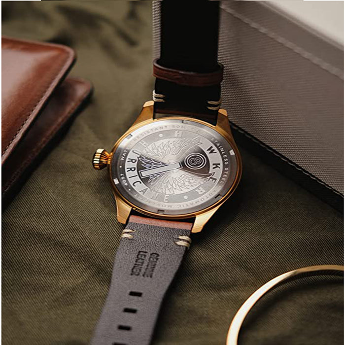 The brand inspiration and design excellence originate from the collaboration between pilots and engineers who served in air forces around the world. Every collection is an explicit homage to the planes, people, and history of military aviation. Each timepiece brings to life the detail and narrative of the inspiration to delight and engage the wearer. The Hawker Hurricane Clowes Automatic features a 46mm stainless steel case, a 22mm genuine leather strap, a sapphire lens with an anti-reflective coating, and water resistance of 50 meters.