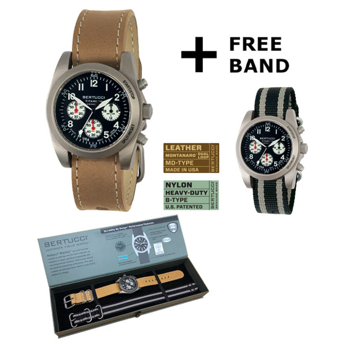 Bertucci Men's A-11T Americana Black Dial Canoe Matte Horween Analine Latigo Leather Band Chronograph Watch