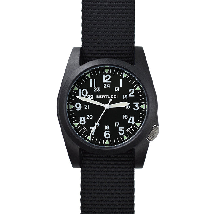 Bertucci Men's Black Dial Band Nylon Wrist Watch - 13350. The A-3P Sportsman Vintage Field is inspired by classic American field watches that embody the spirit of adventure. The result is a combination of refinement, durability and versatility ... built for performance, function and lasting value. Equipped with the patented USA type D strong nylon band Product Features: Durable USA patented fiber reinforced polycarbonate shell, stainless steel crown and hardened mineral glass back case, scratch resistant, movement of Japan made quartz, super luminous Swiss hands and markers, easy to read dial with 12/24 hour markings. Built-in durability with 328.1 ft water resistance certification.