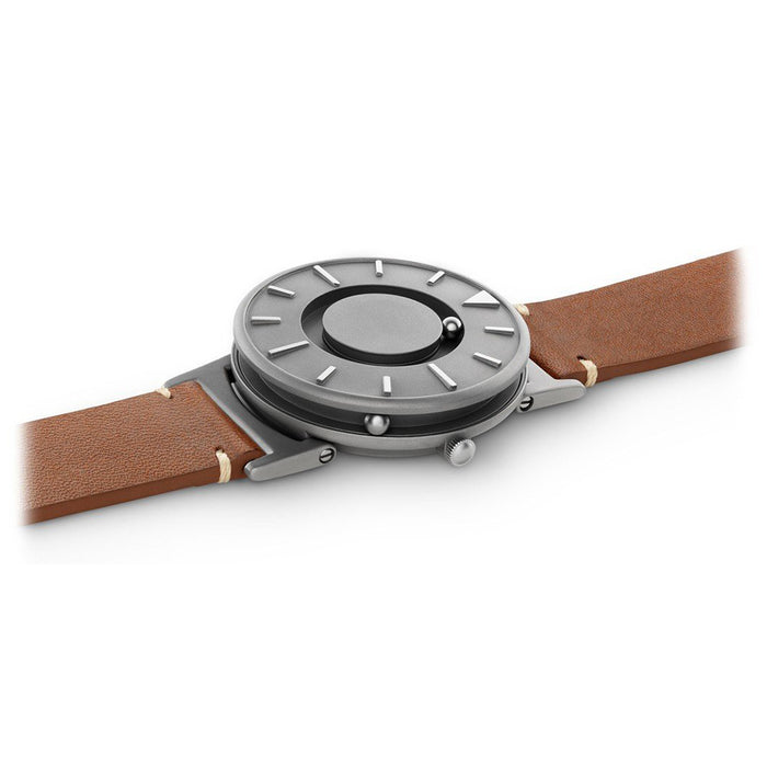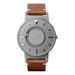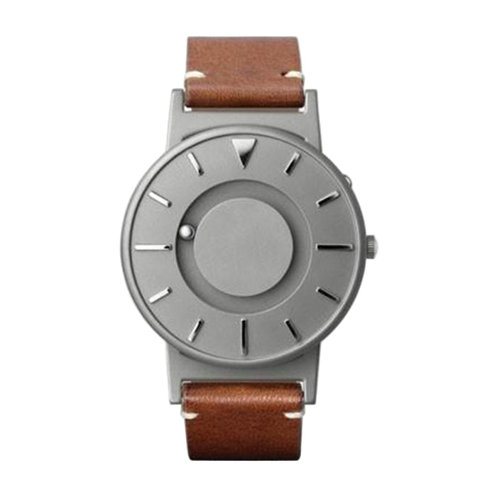 The Eone Watch - BR-BRWN is a sophisticated timepiece that seamlessly blends style and functionality. Designed to cater to both men and women, this watch boasts a timeless aesthetic that suits various occasions. The round silver stainless steel case of the watch exudes a classic charm and durability. Complementing the case is a brown leather band that not only adds a touch of warmth to the design but also ensures comfort during extended wear. The leather band is carefully crafted, providing a refined and elegant look that transitions effortlessly from day to night. The watch face features a minimalist design with silver indices and hands, offering a clean and easy-to-read display. The absence of traditional watch hands is compensated by a tactile ball bearing system, allowing users to tell time through touch. This innovative feature makes the timepiece inclusive and accessible to those with visual impairments.