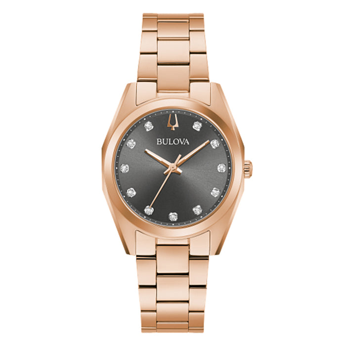 The classic Surveyor line from Bulova has been updated with a Dress Sport ladies watch. This rose-gold watch has a stainless steel case and bracelet with an elegant flair. The sunray grey dial is hand set with 11 diamonds for both the look and feel of a luxury watch. This quality timepiece is well-made and beautifully detailed, making it an elegant addition to any collection.Bulova Classic 97P156 is an incredible trendy Ladies watch from Surveyor collection. Case material is Stainless Steel while the dial colour is Grey. This watch is market as water resistant. It means it can withstand slight splashes and rain, but is NOT to be immersed in water. We ship it with an original box and a guarantee from the manufacturer.