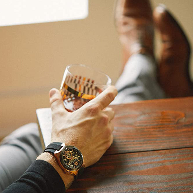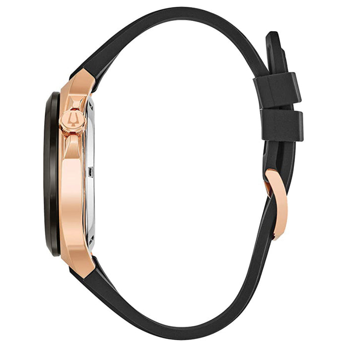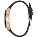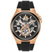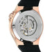 From the Automatic Collection. New Sport style in rose gold-tone and gun stainless steel case, open aperture black dial with rose gold-tone accents and black inner dial ring, exhibition case back, skeleton automatic movement with 40-hour power reserve, sapphire glass, matte black silicone bracelet with buckle closure, and water resistance to 100 meters.