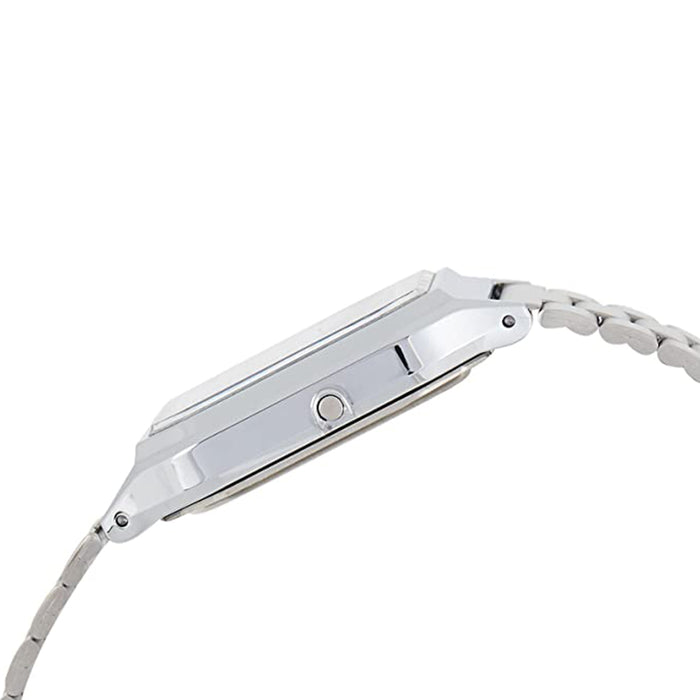 Set in a stainless steel case and secured with a complementary bracelet strap, this silver analog-digital watch from the Youth Combination collection by Casio is the perfect slice of sophistication for your formal wardrobe. Featuring a quartz movement that is coupled with a digital display, this watch boasts of a water resistant system that makes it perfect for routine wear. This watch comes with a resin glass and an adjustable buckle.Features: display: 2-hands, display: analogue, display: digital, display date display, stopwatch, alarm clock, stopwatch, light, case material: stainless steel, case diameter: 38.8 mm, strap material: stainless steel, colour: silver/black, material: metal