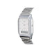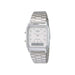 The Casio Men's White Dial Silver Stainless Steel Band Digital Quartz Watch combines classic design and current functionality. It has a clean white digital display and provides key features such as time, date, alarm, stopwatch, and an LED backlight for easy viewing in any lighting condition. The durable silver stainless steel band and case create a sleek, classic design that is appropriate for both casual and formal occasions. This watch's durable quartz movement offers exact timekeeping with minimal maintenance. It is a practical choice for regular usage, thanks to its water resistance. Ideal for individuals who want an attractive, adaptable, and trustworthy digital timepiece.