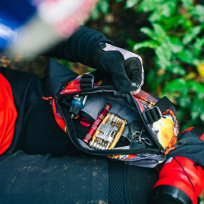 Our new Hot Laps 1L Waist Bag has an ultra-intentional design that features a single deployable water bottle pocket, external straps for pads, and one cargo pocket with organization for tools, a tube, and snacks. Its compact size will stay put through the jankiest tech sections, but its deliberate functionality ensures you're repair-prepared.