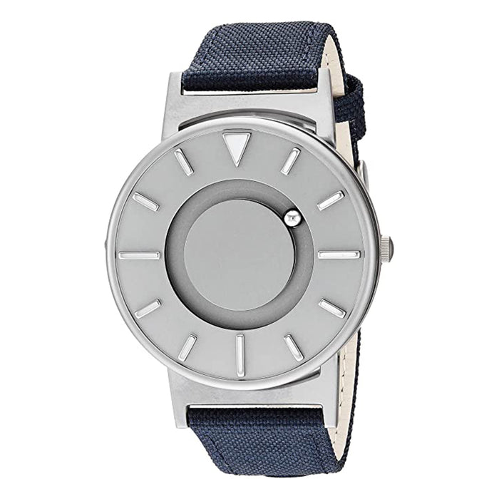 EONE Unisex Bradley Classic Canvas Aqua BR-C-Blue Watch - BR-C-BLUE. The minimalist face of The Bradley Canvas features raised hour markers brushed in a smooth mirrored finish. The pure titanium case body adds an air of elegance and durability to the piece. Available in six color varieties, the wristband is fashioned from a dyed canvas strap paired with a soft tan leather interior, adding the perfect pop of color to any outfit. The Bradley timepiece features a triangular marker for twelve, and elongated markers for three, six and nine in order to increase tactile legibility. The ball bearing on the inside of the markers indicates the minute, and the ball bearing running along the outer edge of the watchface indicates the hour.