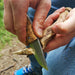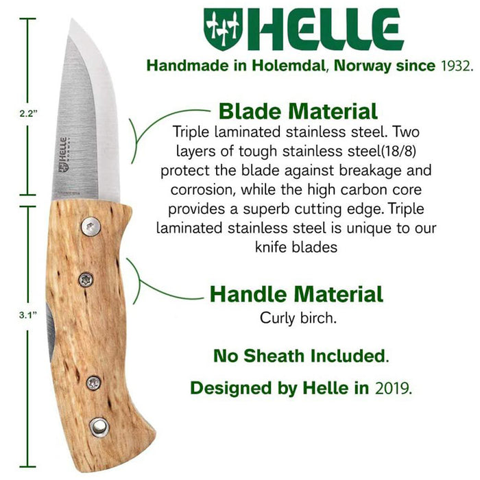 HELLE Kletten Triple Laminated Stainless Steel Drop Point V Grind Traditional Folding Knife - HELLE662. Kletten is Helle's smallest blade yet. Weighing in at 84 grams, Helle’s first everyday carry, is a pocket-sized companion for simple, everyday tasks. Based on 87 years of Scandinavian design, the Kletten is an heirloom quality gentleman’s knife with a slim, elegant and handcrafted finish. The characteristic curly birch scales add depth of pattern and color to each handle, reinforced with stainless steel liners and a stable lockback design. Blade | Triple laminated stainless steel. Two layers of tough stainless steel(18/8) protect the blade against breakage and corrosion, while the high carbon core provides a superb cutting edge. This triple laminated stainless steel is unique to our knife blades.