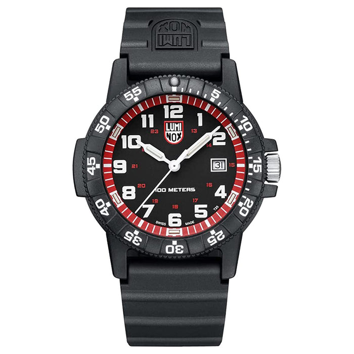The Leatherback Sea Turtle Giant watch gets its name from the design of the watch, the classic Luminox case with the protected crown balanced by an opposite outcropping, resembles the shape of a turtle. The 44mm case is made of durable and lightweight signature CARBONOX and is water resistant up to 100 meters. The classic Luminox black dial with white numerals and hands features a vibrant red outer dial ring for sporty design. As with every Luminox, it is equipped with the proven Luminox Light Technology lighting system, providing at-a-glance visibility for up to 25 years. The watch features are: Origin: Swiss Made Always Visible: Constant glow for up to 25 years Size of case (diameter): 44 mm Function: Time Date Water resistance: 100 meters, Movement: Ronda 515, HH6 Case material: CARBONOX Bezel: CARBONOX uni-directional rotating, superluminova at the 12h Case back: CARBONOX screw on Crystal glass material: Hardened mineral crystal Crown: Double security gasket, crown protected Strap / bracelet: Silicone rubber Lug width: 22 mm Case height: 12 mm