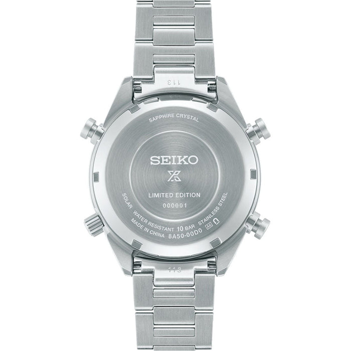 The Speedtimer Solar Chronograph Series is the latest in the Prospex Collection. Inspired by Seiko's first precision chronographs, developed for international sporting competitions in 1964 combining the convenience of solar power and rugged durability with sporty style the chronograph collection comes in several variations. Part of Seiko's 110th Anniversary Limited Edition collection. The 42mm polished and brushed stainless steel case has a white vertical striation patterned dial under a curved anti-reflective scratch resistant sapphire crystal.