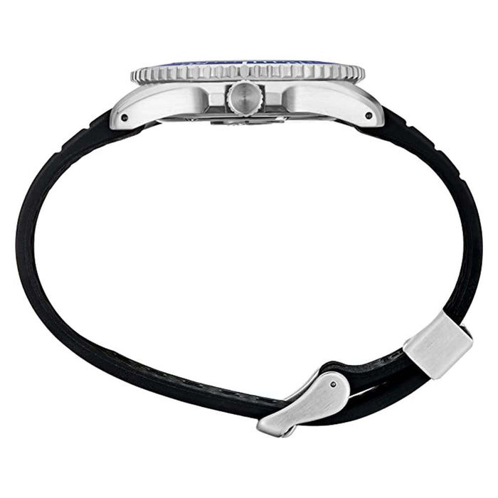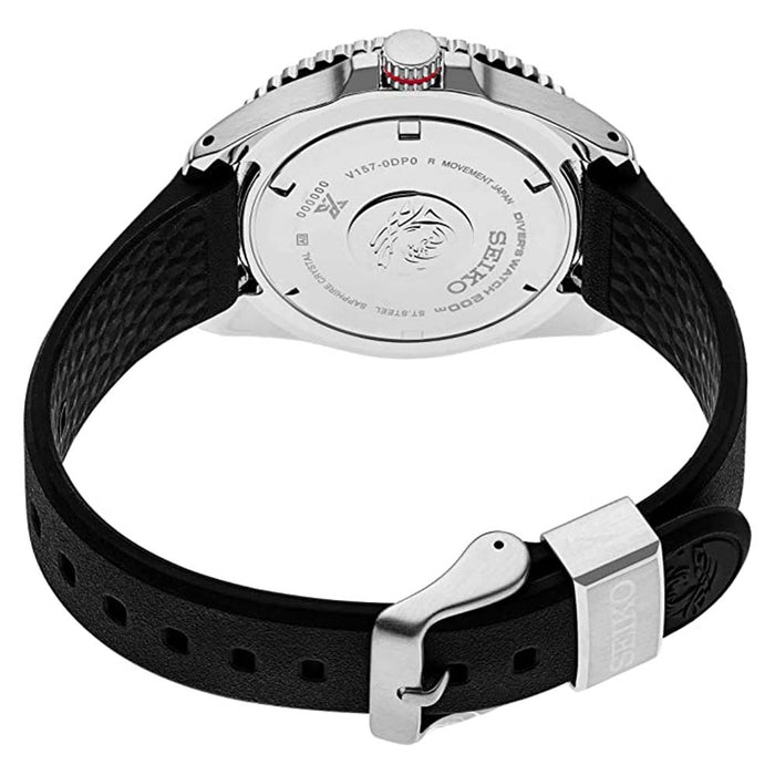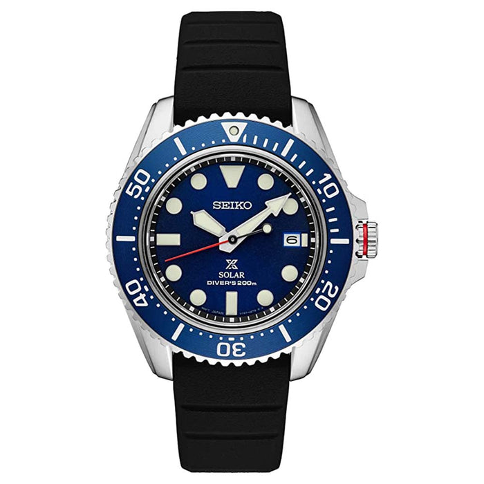 The SNE593 solar dive watch has a 42.8mm brushed and polished stainless steel case with a blue dial. The matching blue rotating uni-directional 120-click elapsed timing bezel is well suited for professional diving with 200-meter water resistance. A red bulbous tipped seconds hand with luminous hands and circular markers make for easy readability in any environment. Equipped with a date window positioned within the indices behind a scratch-resistant sapphire crystal. Powered light through Seiko's solar caliber V157 with a 10-month power reserve. The screw-down crown is strategically positioned at 4:00 for increased comfort and provides added security against moisture and dirt intrusion. Fitted with a comfort-fit black textured silicone rubberized strap with tang buckle and stainless steel metal safety keeper to keep your watch secure and in place.
