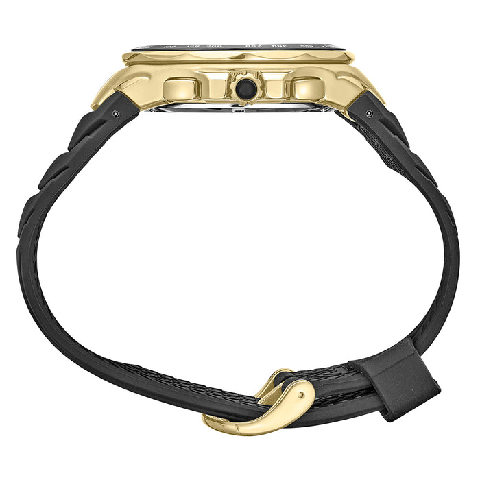 The solar-powered Coutura watch with a power indicator chronograph is the perfect blend of technology and design with an angular case and bracelet design. While it is appropriate for day or evening wear, it is unique thanks to its black dial with a pressed 3D cubed pattern with a brushed finish and outer tachometer track covered by a satin-finish bezel that has stylish notches. Gold-tone stick markers on the hour pointers, which have luminous sword-style skeletonized hands, are easily one the hour on the sapphire crystal.