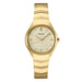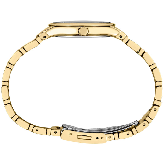 From the Essentials Collection. With sleek sophistication, this distinctively modern watch makes an immediate style statement. The clean, minimalist dial, in light champagne with simple stick markers, features a subtly varying metallic texture for added visual interest, while the soft curves of the bracelet are highlighted by a mirror and hairline finish. In stainless steel with rich gold finish, this memorable timepiece includes a tri-fold push button release clasp. 5 bar, 50M Water Resistant.