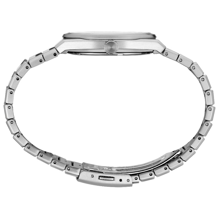 From the Essentials Collection. An updated classic, this sleekly angled watch features a black pressed-pattern dial with simple stick indices, a date calendar, and LumiBrite hands and markers. Crafted of stainless steel with scratch-resistant sapphire crystal, this versatile timepiece includes a secure screw-down case back and tri-fold push button release clasp. 10 bar, 100M Water Resistant.